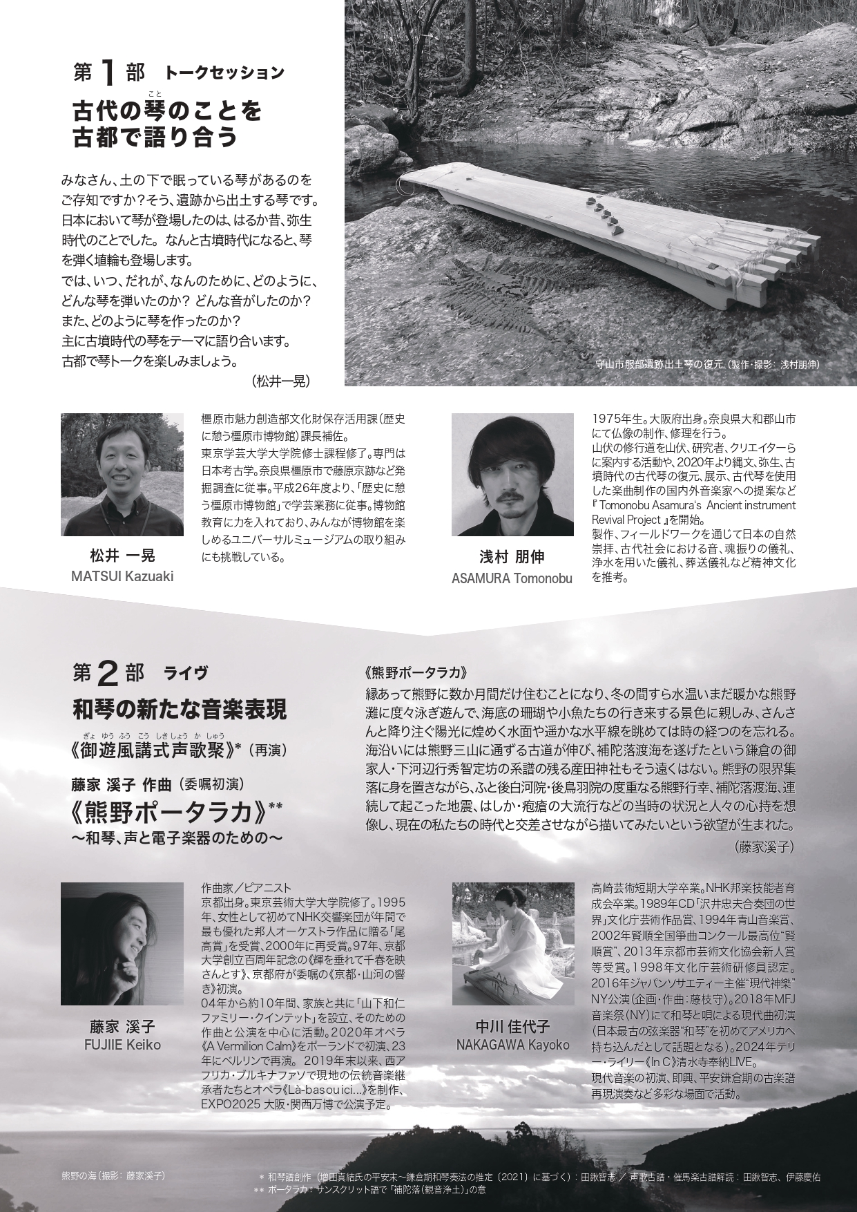 藤家さんによると、奈良の仏師・浅村朋伸さんが遺跡から発掘された琴のレプリカをいくつも制作されており、そのうち滋賀県服部遺跡の出土琴のレプリカに麻弦を張り、音を出してみたいとのことでした。コンサートは、3月23日に京都市立芸術大学伝統音楽センターで開催される予定です。